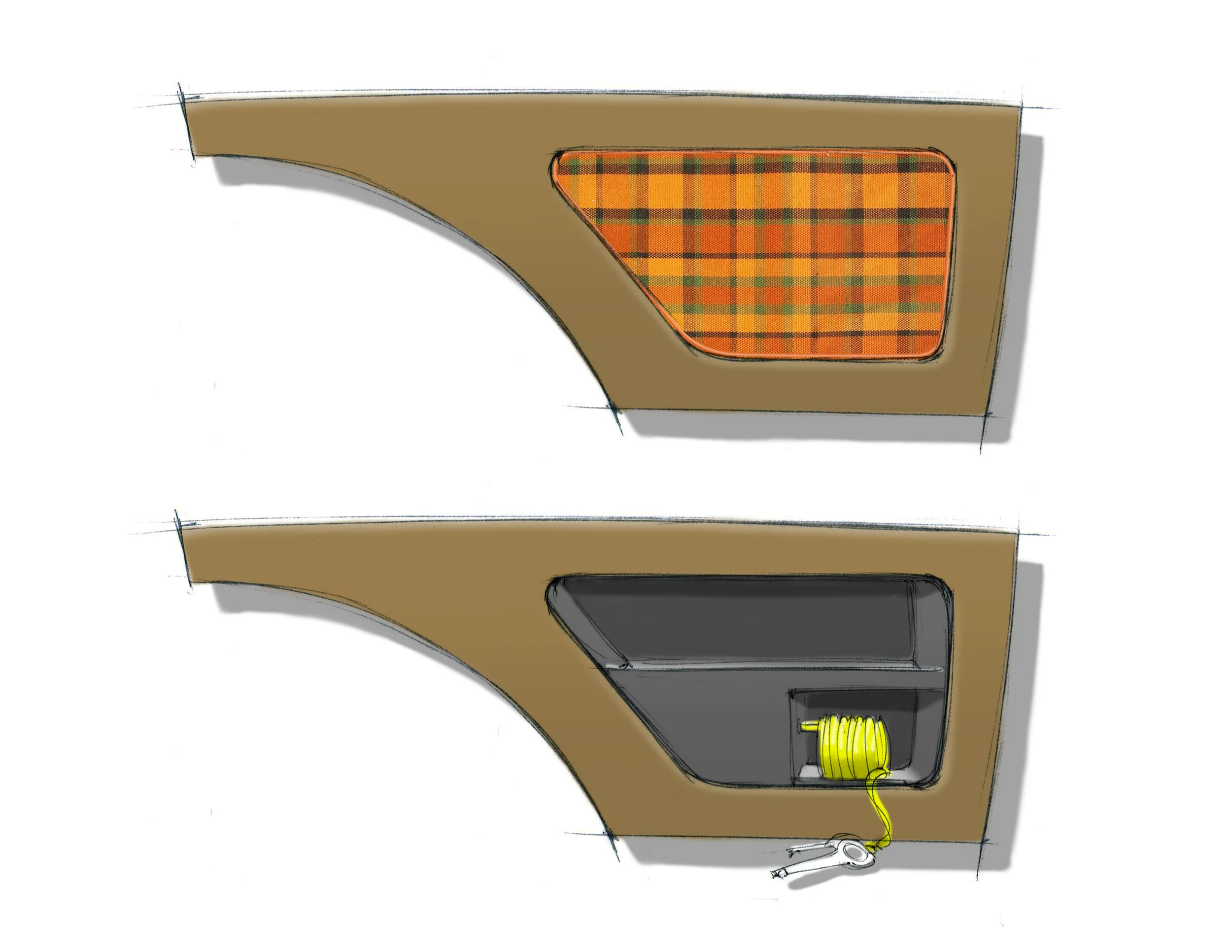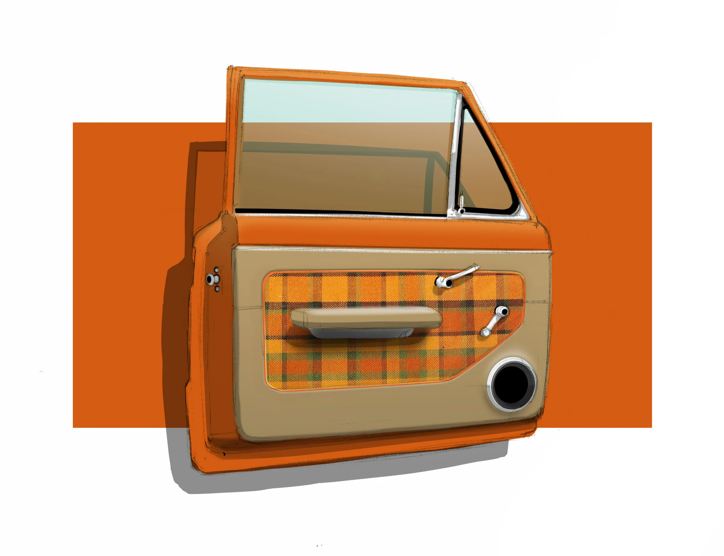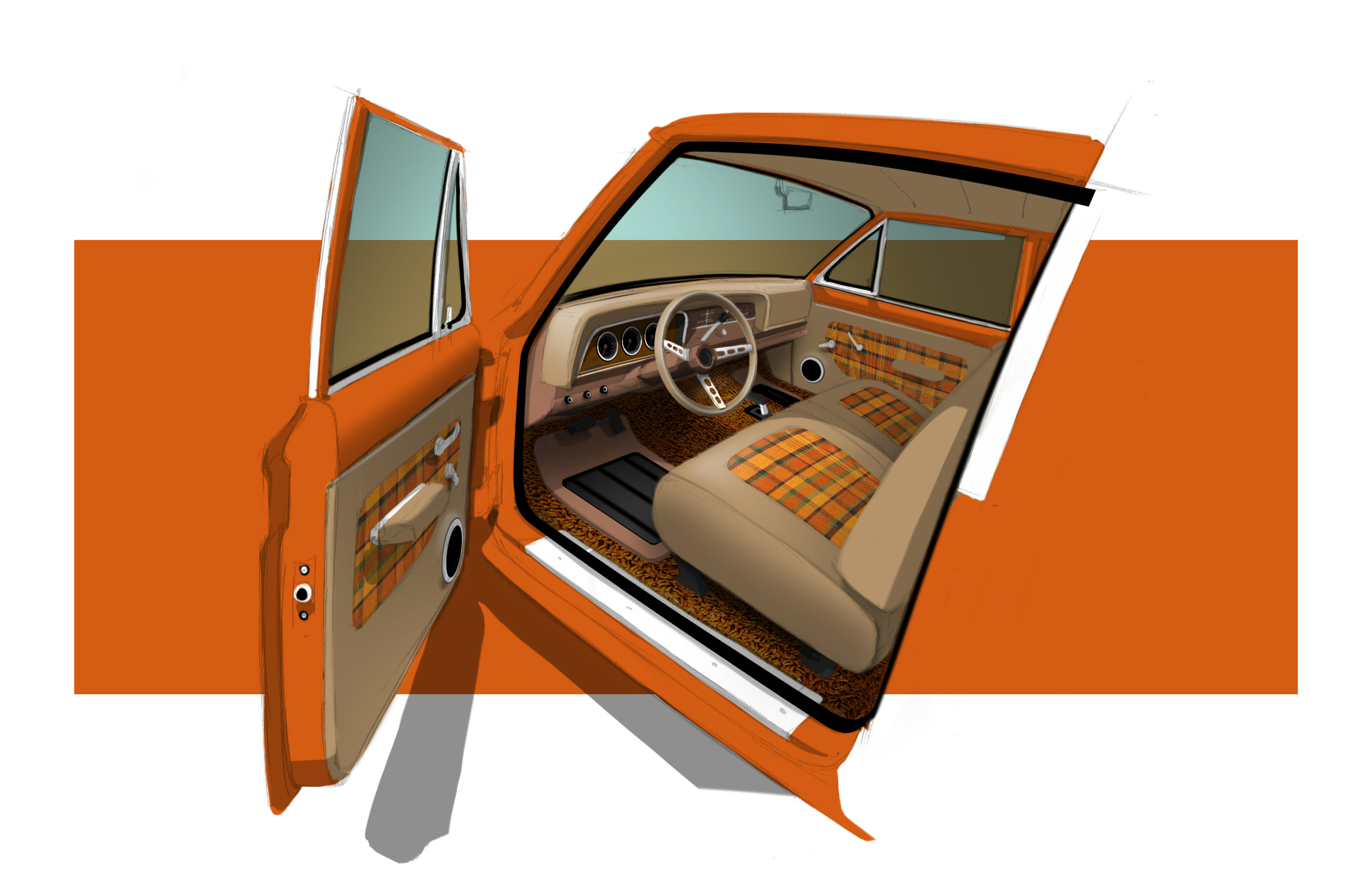The interior carries the same 70's theme to maintain an original look with custom designed and fabricated interior elements including re-contoured seats, wood plank cargo flooring, shag carpets, and an air compressor compartment. Featuring orange and brown plaid on tan vinyl for full seventies kitsch effect.